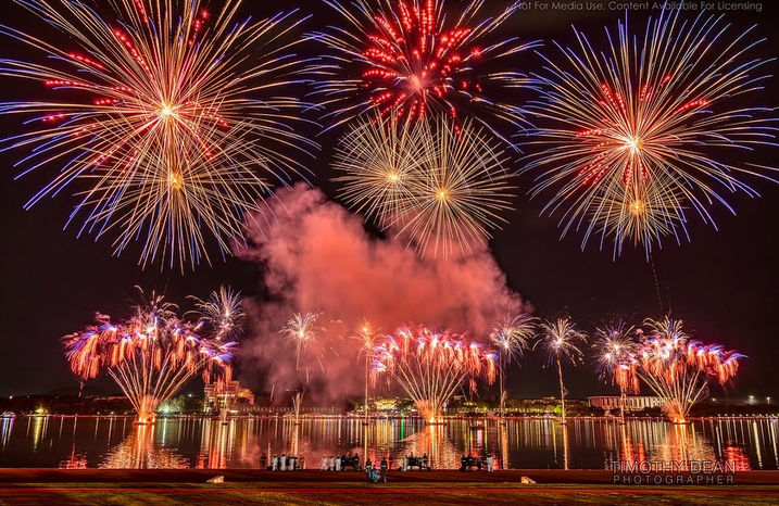 Canberra Skyfire is the highlight for the ACT in fireworks displays which are simulcasted on FM104.7 with a duration of 20 minutes. The display is water based and fired from barges and pontoons.
