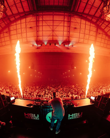 A 'Circle Flamer' or 'Wave Flame' is a special effect machine that produces a circular flame pattern by utilizing a rotating nozzle that can swivel around a 180-degree arc, allowing it to project flames in a circular motion. However, cannot shoot coloured fluid.